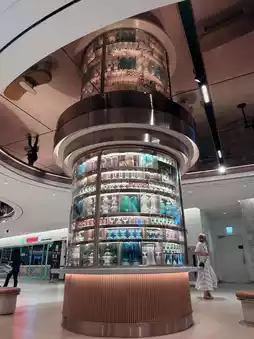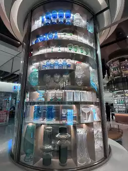 This time, I stumbled upon another surprise at Starfield Coex Mall. Heading towards the dining area, I discovered pillars adorned with tableware—antique plates, bone china cups, glassware, vases, and wine bottles. When illuminated, the arrangement reflects off copper sheets above, creating a surreal and intriguing ambiance.