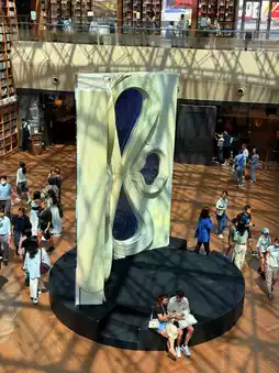 During this visit, the library was as bustling as ever. The 13-meter-high bookshelves, stacked with 50,000 books, create a "golden house" that is mesmerizing due to its spatial design and lighting effects, which cast enchanting shadows and light patterns.