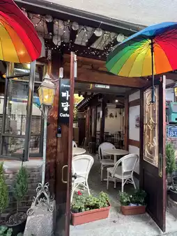 The rainbow umbrellas hanging upside down in the courtyard, blending with the tranquil scenery of the Hanok, created a bright and warm atmosphere, making our time together even more beautiful. Sharing a cup of tea in the traditional Hanok structure calmed my mind, and the sunlight streaming through the umbrellas added a cozy touch. 🌺