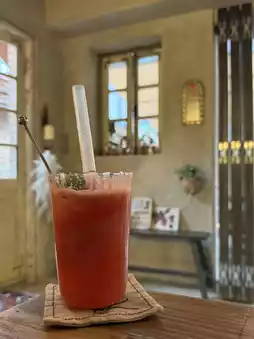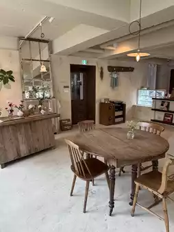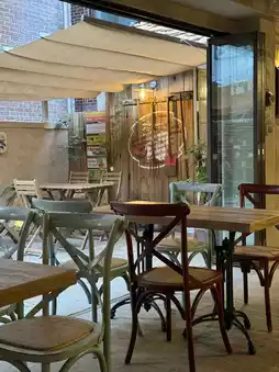 The interior is decorated with wood-toned tables and chairs, and the softly colored walls create a calming atmosphere. It's a modest but cozy space. ✨