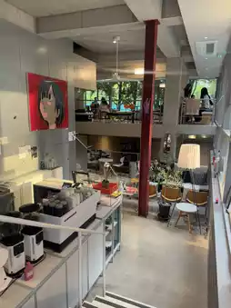 The cafe's cozy atmosphere exudes art and design, creating a relaxing atmosphere.