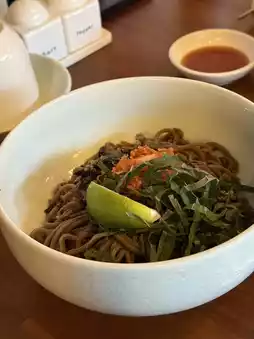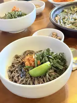 This time, I ordered the Onban, Perilla Oil Noodles, and Seafood and Chive Buchimgae. ☺️ I had the Perilla Oil Noodles as my main dish, and it was addictively delicious. 🖤 I ate it with a squeeze of sudachi citrus juice, which made it refreshing and delicious. ◎
