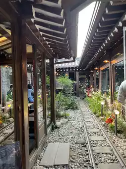 I visited the Nakwon Station cafe in Ikseon-dong. This place, with its serene Hanok atmosphere and a recreated train track, felt like a nostalgic stop at an old station. From the entrance, the floor designed like train tracks and retro decorations caught my eye, while the warm lighting combined with the wooden pillars and tiled roof of the Hanok created a cozy yet unique ambiance. 🚞