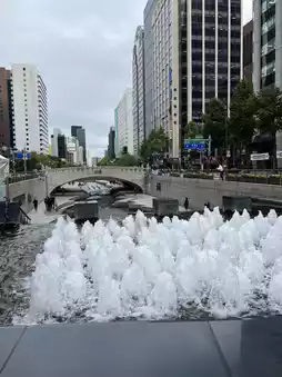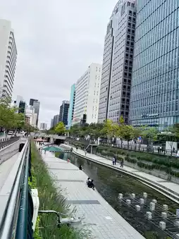 The gray sky reflected on the water, and the gentle sound of the water allowed me to forget the noise of the city for a moment. The slow pace of people holding umbrellas and the grass growing along the water's edge created a landscape reminiscent of a sumi-e painting. Walking in the weather that seemed to be about to rain, I found myself calming my mind and becoming lost in thought. Cheonggyecheon was a truly beautiful urban walkway that revealed different charms depending on the weather.🌺