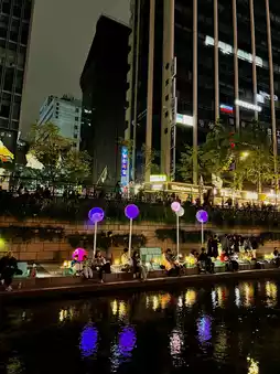The twinkling lights and the sound of flowing water created a tranquil yet warm atmosphere. It was truly special to find such a comfortable space for reflection in the heart of the city. The sight of people reading and the whispers of conversation mingled, making Cheonggyecheon's nighttime atmosphere even more captivating. 🌳