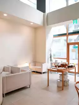 A space of leisurely rest where the openness of high ceilings blends neat white with the cozy harmony of wood, and the exterior is made of glass, providing a cool feeling and allowing the bright sunlight to seep in.