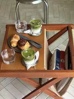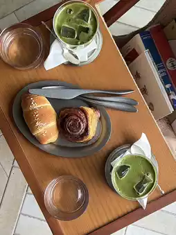 I love how they have so many breads lined up, like salted bread, even in the morning 🥯By the way, their Jeju Matcha Latte, made with Jeju Island matcha, is so delicious, you should definitely try it...