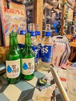 The interior is reminiscent of a Japanese izakaya, with retro-cut neon signs and posters.