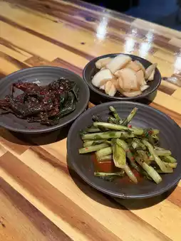 I ordered one jjigae. I chose kimchi jjigae. It had a sour taste that I like. The price varies depending on the number of jjigae you order. I got the minimum of six dishes: king oyster mushrooms, eggplant, tofu, green shiso with minced meat, swordfish, and jellyfish.