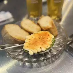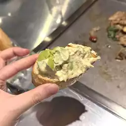 The side menu, avocado menta mayo, is served with a whole avocado topped with cod roe and mayo sauce. Mix it well and spread it on baguette slices for the perfect pairing with drinks!!!🫶🏻