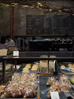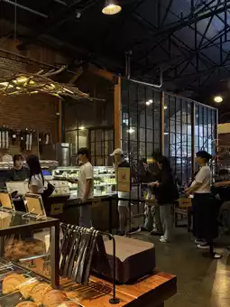 The center is mostly filled with bread, while a small display showcases cakes before the checkout.