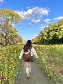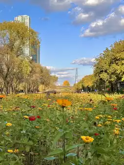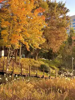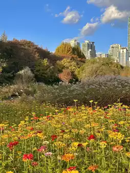 As the autumn sunset gently descends, the walking trail along Yangjaecheon is lined endlessly with blooming zinnias. The mix of yellow, orange, and pink creates a path that feels like a warm and cozy painting.