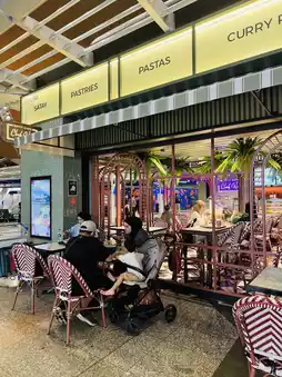 The pastry counter was tempting—I picked a buttery croissant and a flat white. Such a cozy corner to relax before boarding!