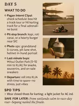 Sepang International Circuit (SIC): check schedules—track tour, museum corners, or a karting session next door (availability varies).
