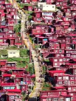 • 🏠 Red monastic houses covering the hills