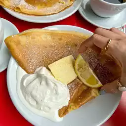 I ordered the classic lemon, sugar, and butter crepe, and it was absolutely delicious! The combination of tangy lemon, sweet sugar, and rich butter on a perfectly thin crepe was simple yet so satisfying. I could see why this place is so popular! The café itself has a relaxed and welcoming vibe, making it a great spot for a casual coffee break or a sweet treat.