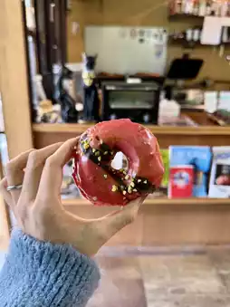 The café itself has playful details — including round tables shaped like doughnuts! It’s a small space but full of personality, making it perfect for a casual treat or a quick break during your stroll.