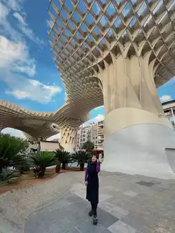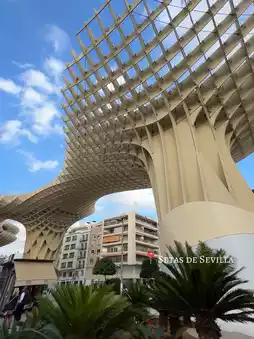 The Metropol Parasol, is a wooden structure with 2 concrete columns that houses the elevators to access the viewpoint and is located in the central Plaza de la Encarnación in the city of Seville.