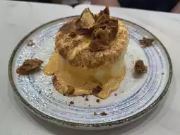 As a pistachio lover, I fell in love with this at first sight 😻 Thick soufflé pancakes are full of air, sandwiched with oversized balls of pistachio 💚 The cream is super smooth, the nutty aroma is rich and not too sweet, the top is sprinkled with pistachio crumbs to increase the crunchy taste, every bite is a happy taste 😋 The pancakes themselves are prominently eggy, with a slight caramel aroma, and the rich pistachio cream is surprisingly greasy, 👍 will not try the whole thing