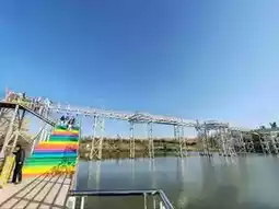 In the golden autumn season, the scenery around the Golden Lake Populus Racecourse is utterly captivating. Vast grasslands don a golden hue, swaying in the sunlight like a shimmering sea. Clusters of populus leaves have turned into a brilliant gold, glowing brilliantly against the clear azure sky. The glistening waters of the wetlands reflect the autumn-tinted populus forest and a distant waterwheel, together composing a serene yet magnificent panorama of the western autumn.
