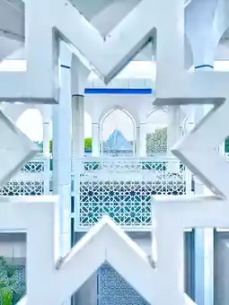 *To enter, you must follow the guides provided by the mosque. They are stationed at the entrance, offering free services and blue robes. Once you've changed, you can explore the mosque together! The guides will also share the best photo spots and even help you take pictures!