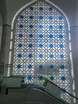 Blue and white Islamic patterned dome + giant crystal chandelier, sunlight shining through the stained glass is super dreamy! Wearing a light-colored long skirt is recommended for better photos~