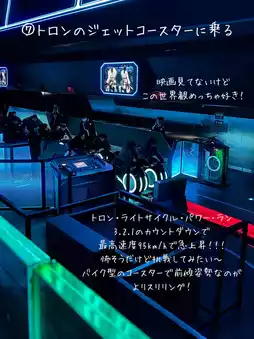 Tron Lightcycle Power Run. With the countdown of 3.2.1, you soar with a start dash at a maximum speed of 95km/h. It looks scary, but I want to try it. The forward-leaning position on the bike-shaped coaster makes it even more thrilling!