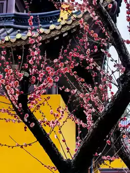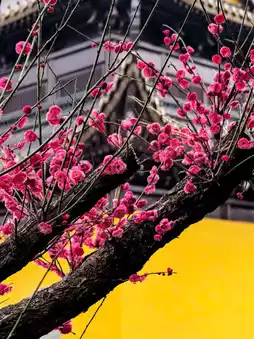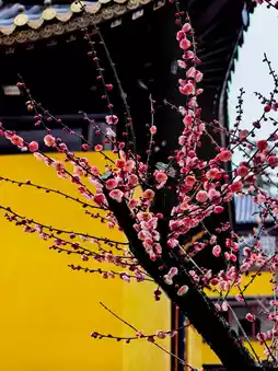 The combination of the red plum blossoms and the classic yellow of the Buddhist temple creates a picturesque scene of classical beauty.