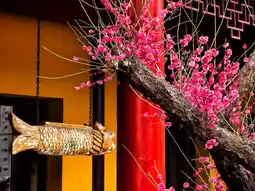 The four plum trees are located next to the water feature on the right side of the main hall, exuding a subtle fragrance in a quiet corner.