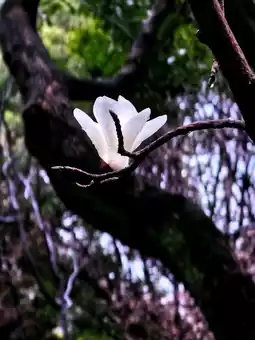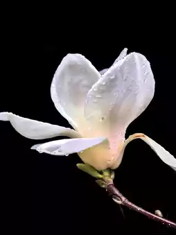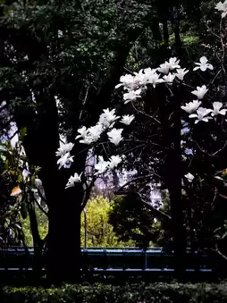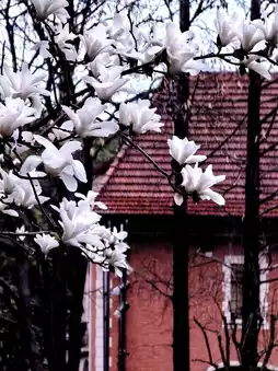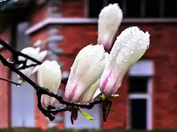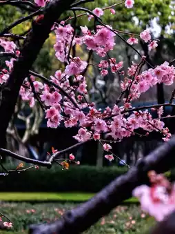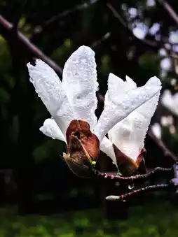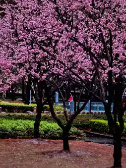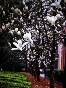 The white magnolias tremble in the wind, holding bone china cups, their petal tips dripping with cold pearl-like light, as if to fill the entire early spring chill; the pink peach blossoms in the rain look like freshly blossomed rouge tears, frozen on silk-like thin petals; the purple-leaf plums have pure white and pale pink petals draped over dark branches like wedding gowns; deep within the rain curtain, tulip spike-shaped buds are tightly wrapped in satin swaddling, waiting for a sunny morning to arrive.