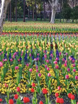 The East Garden is definitely the park’s treasure area, with over 40,000 tulips blooming freely—about 70-80% in full bloom—colorful like a natural oil painting. Small pansies dot the flower beds, full of rustic charm. On sunny days, every corner shines like a poem; any snapshot you take will look like a stylish French film scene. Even more delightful, a few purple-leaf plums nearby are also in full bloom, their pink petals complementing the colorful tulips, creating a dreamy fairy-tale setting.