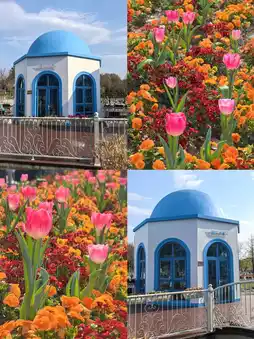 The tulip fields in front of the blue cottages are in full bloom! The entire circular path is planted with tulips, featuring two background color combinations: yellow-purple and red-yellow.