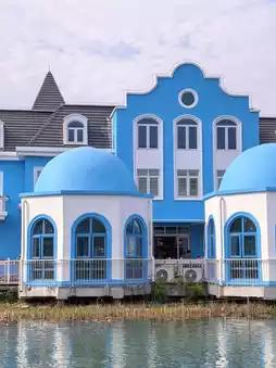 Enter from Gate 3 and walk straight for 5 minutes; by the lake are two fairy-tale-like blue cottages! On sunny days, the lake reflects the blue sky, making it feel like Santorini Castle. Wearing white clothes is recommended, and the light is softer after 3 PM.