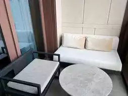The room interior had wooden floors instead of carpet, so it felt clean without dust. The interior was decorated in wood tones, creating a warm and cozy atmosphere. The sofa next to the bed was foldable and could be unfolded into an extra bed when needed.