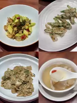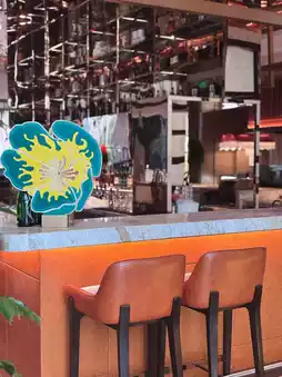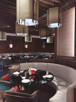 The all-day dining restaurant is on the first floor. Since it and the lobby bar are both semi-open, they are combined during breakfast to provide more seating. The walls surrounding the restaurant are designed with wooden panels inspired by fish market crates, while the beige hollow bricks used to separate spaces are adapted from traditional courtyard exterior walls.