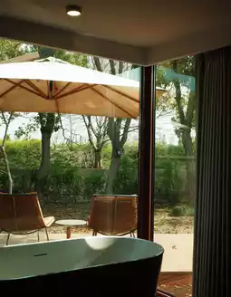 We booked a small suite, and as soon as we entered, we were captivated by the huge room✨. It also had a huge floor-to-ceiling window, and each room came with its own small courtyard. Looking out the window, all you see is green, super healing🌿.