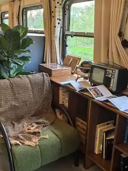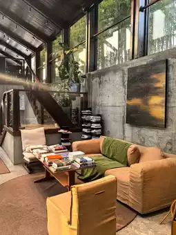 Inside, there are green plants and cozy seats all set up, with amazing natural lighting!