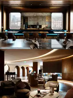 The lobby, located on the 7th floor as a "sky art gallery," features brass-colored walls flowing with soft yellow light, a giant green wind chime hanging like a frozen rain curtain, and curved viewing windows framing the Bund’s silhouette into a dynamic oil painting. Sitting here for afternoon tea, it’s hard to tell if the reflection in your cup is the shimmering Huangpu River or the golden mirrored patterns of Art Deco.