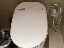 📍 The bathroom and shower areas are separated by doors. The toilet is an automatic flush type without a bidet.