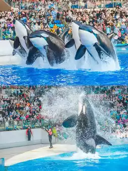 ✔️ Five members of the orca family gather to perform a stunning blockbuster at the Orca Theater. When they leap out of the water, huge splashes fly, combining power and beauty. The cheers and gasps from the audience never stop, making every moment thrilling! (Remember to wear a raincoat if you sit in the front 5 rows!)