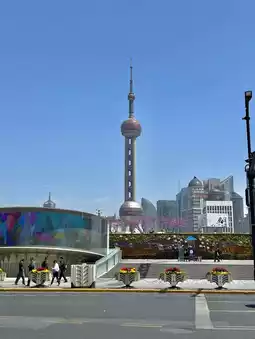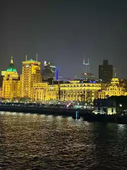 The glowing Oriental Pearl Tower and the buildings along the Huangpu River,