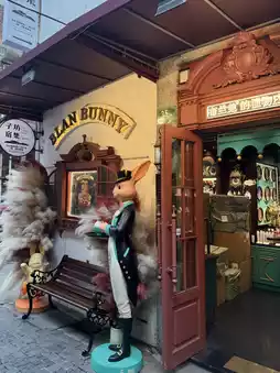 The fairy-tale-like interior of Blanbunny Tea House offers not only tea but also souvenirs. Especially adorable are the tea sets and goods featuring the rabbit character.