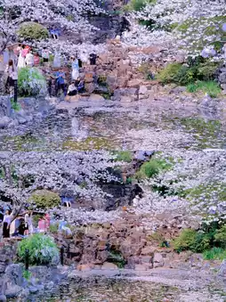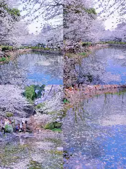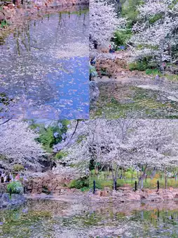 ✔️For portraits, it’s best to shoot on the left side of the artificial hill, where the cherry blossoms are dense and the petals in the pond behind are concentrated.
