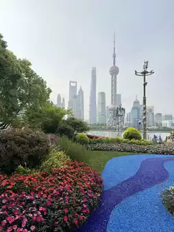 This is a riverside park along the Huangpu River with a view of Shanghai’s iconic skyline — the Oriental Pearl Tower, Shanghai Tower, and many other landmarks.