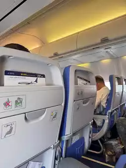 - Outbound flight: 3-3 seating on a small plane | Return flight: larger plane with 3-3-3 seating, has screens, movies are quite old but acceptable, and there is a charger