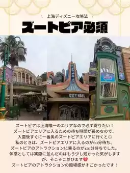 Zootopia is unique to Shanghai Disneyland, so it’s a must-see! The wait time to enter the Zootopia area can be long, so I recommend heading there first thing after entering the park. When I visited, it took 60 minutes to enter the area and 120 minutes to ride the Zootopia attraction. The actual wait felt slightly shorter, but it’s still a significant wait 💔. However, the Zootopia experience was amazing, especially the immersive attraction—it’s definitely worth it!