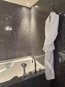 The bathroom was finished with granite-like tiles, giving it a luxurious feel, and it was convenient to have two sinks. There was a large bathtub perfect for enjoying a half-body soak, and the generously provided amenities and fluffy bathrobe left a strong impression. Overall, it was clean and well-maintained.