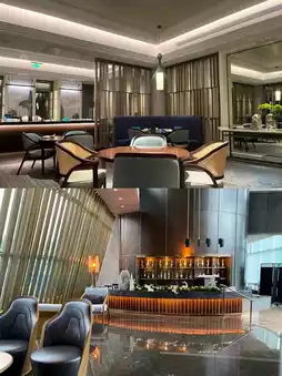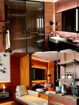 As soon as you enter the hotel, the rock-textured walls paired with vintage industrial-style lighting perfectly combine ruggedness and luxury. It instantly feels like traveling through time into a fascinating world of vintage industrial style. The high-ceilinged lobby is dominated by dark tones, with rock-textured walls complementing metallic decorations. A giant crystal chandelier hangs like stalactites in a mine cave, casting light that makes you feel like you are in an underground palace.