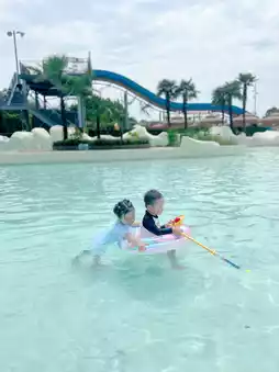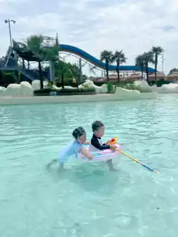 ✔️ White Sand Beach and Wave Pool: The entrance to the beach swimming area is at the white sand beach and wave pool zone. There are some lounge chairs for resting and storing luggage. In front of the white sand beach is the wave pool, which generates waves every half hour 🌊;