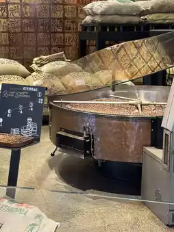 Just walking in is a wow moment. The atmosphere is warm, filled with the rich aroma of coffee. There's a giant coffee roasting machine in the center of the store, like a coffee museum.